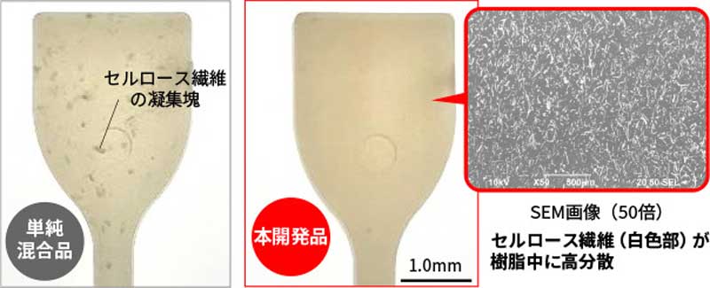 単純にセルロース繊維を混錬しただけでは、セルロースが凝集(※)してしまっていたが、独自の「樹脂混練技術」を用いることでセルロース繊維が満遍なく高分散する ※散らばったりしていたものが、一つに集まり固まること