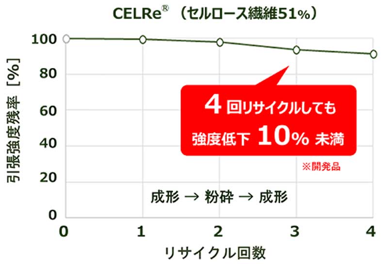 また、粉砕・成形を4回繰り返しても強度低下が10%未満という数値で、マテリアルリサイクルにも適している。