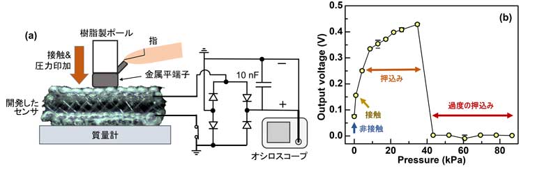 開発したセンサは、環境中に常時放散されている電磁波を利用できるため、外部電源不要の無給電状態であるにもかかわらず、出力される直流電圧値の大小により人のタッチと押圧を検出するタッチ/圧力センサとして動作することが示された。
