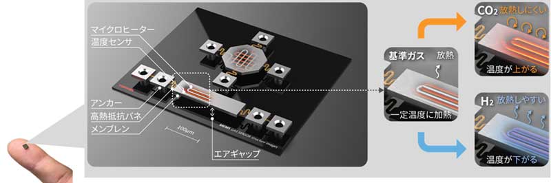 東芝独自のMEMS技術を用いた熱伝導型ガスセンサーの模式図と動作原理