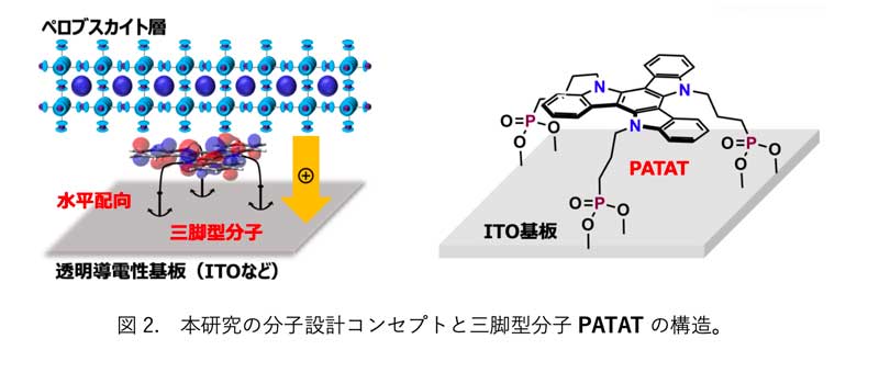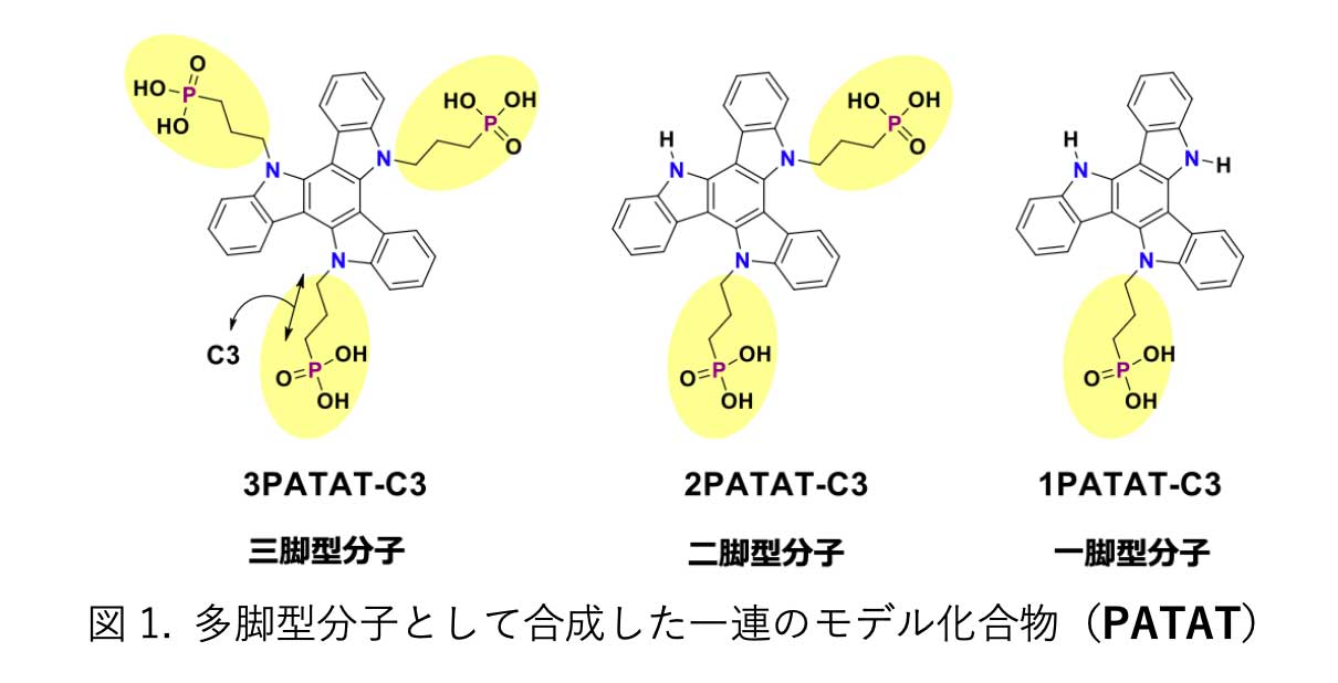 まず、アンカーとしてアルキルホスホン酸基(PA)を3つ導入した三脚型の「3PATAT-C3」を設計、合成した。