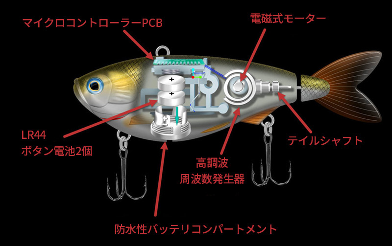 内蔵する電磁式モーターがあらかじめプログラムされた不規則な動きを、テイルシャフトで尾ビレを動かすことで再現し、小魚特有の小刻みな動きを実現するという仕組みだ。