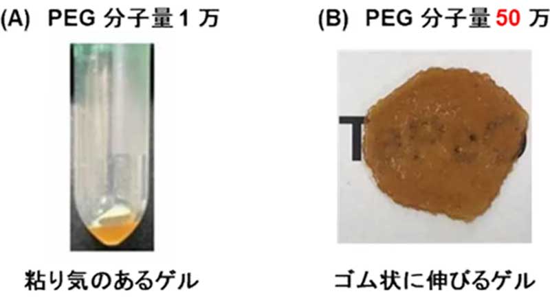 論文によると、研究は一般的な実験で用いられる分子量1万のPEGで行われていたが、東准教授の研究室には、さまざまな分子量のPEGがあったこともあり、この水中混合を、TAと分子量50万の超高分子量のポリエチレンオキシド(PEO)※で試行。すると、混合した瞬間、既報のゲルとは全く性質の異なるゴム状のゲルが得られた。
