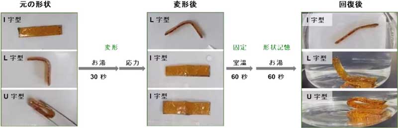また、乾燥させたTaPeOゲルは固く変形しないが、お湯に浸すと変形し、室温でしばらく放置するとその形状で固定されるが、再びお湯に浸すと最初の形状に戻る形状記憶能力を有することも分かった。