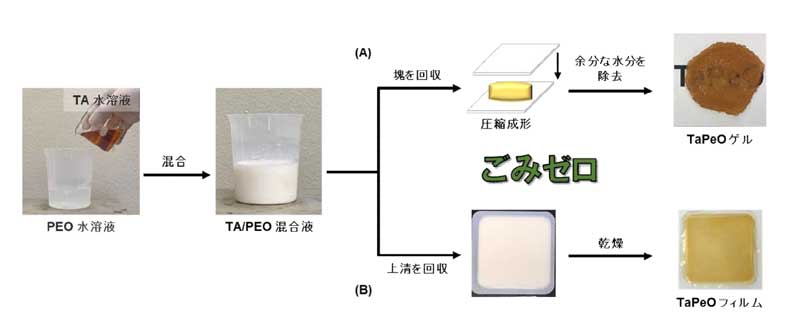 TaPeOゲル(A)調製で生じる上清もTaPeOフィルム(B)として活用でき、安全性の高いTAとPEOによる、余す部分なく活用できるサステナブルな新素材の調製法が確立