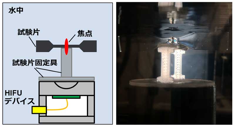 DCBを含まない架橋高分子材料の試験片に対して水中で高出力のHIFUを照射するイメージ図(左)、実際に照射して試験片が解体した瞬間