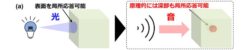 光と音の外部刺激としての違いを表すイメージ図。音の場合は原理上、振動が届けられた深部や局所的にも刺激を与えることが可能となる