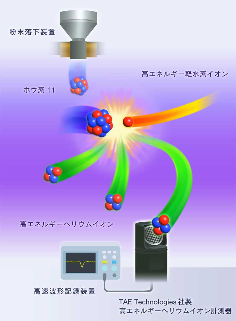 実証実験のイメージ図。時速1500万kmを超える速さの軽水素と、プラズマ内に落下させたホウ素11を用い 核融合反応を起こし、その生成物の高エネルギーヘリウムを検出する