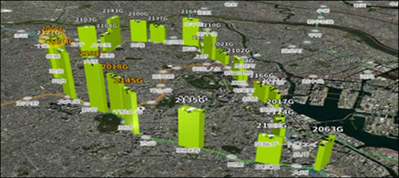“走る列車グラフ”(山手線)表示例。列車の乗客数が列車位置に高さで表示される。鉄道運行の透明性と効率性を高め、輸送障害時の旅客の不便を最小限に抑えることが可能に