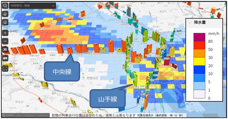 「JEMAPS」での“鉄道運行×局地的大雨”の表示例