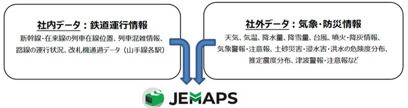 JR東日本では、2022年6月から「JEMAPS」を使用開始。自然災害が発生した際、鉄道運行状況、警報・注意報、土砂災害や浸水害の危険度分布を地図上で複合的かつリアルタイムで確認できるようになった。