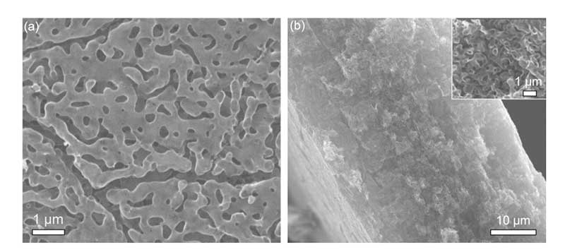 窒素ドープ多孔質グラフェンの表面像(a)と断面像(b)