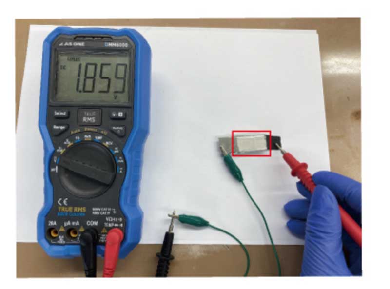 全固体マグネシウム空気一次電池と大気中での開回路電圧の測定値(約1.86V)