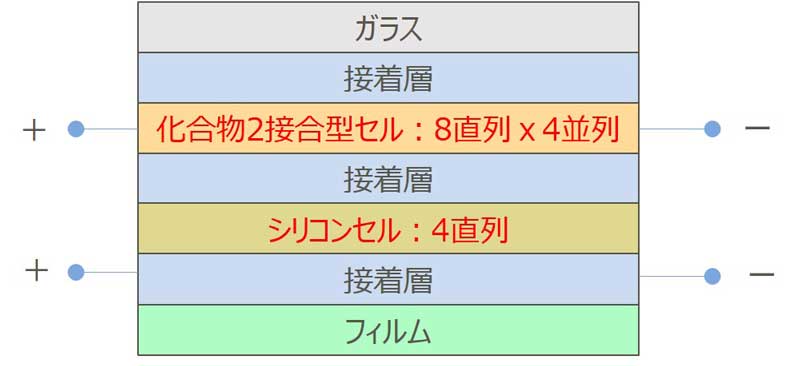 化合物2接合型太陽電池モジュールは、トップ層にインジウム(In)、ガリウム(Ga)、リン(P)を、ボトム層にGa、ヒ素(As)を使用した2つの光吸収層を有する太陽電池である。
