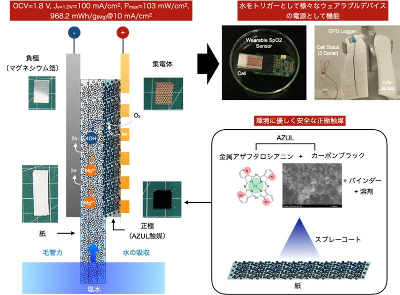 金属空気電池はこれまで低環境負荷で使用しやすくするため、正極を紙の表面に形成、負極に亜鉛を配置し電解液をトリガーに発電する「金属空気紙電池」の研究が報告されている。しかし、それらには有害なアルカリ性の電解液が必要であったり、電解液を塩水で代替した場合、実用的な出力が発揮できない課題を抱えていた。