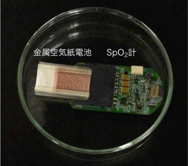 この金属空気紙電池は導電助剤としてカーボンナノファイバー(CNF)を正極に混合すると、集電体を用いずデバイスと直接接続させることができ、新型コロナウイルス感染に伴う血中酸素濃度の低下を監視する「SpO2計」など人体へ直接触れるウエアラブルデバイスへの応用を視野に、実証実験を行っている。