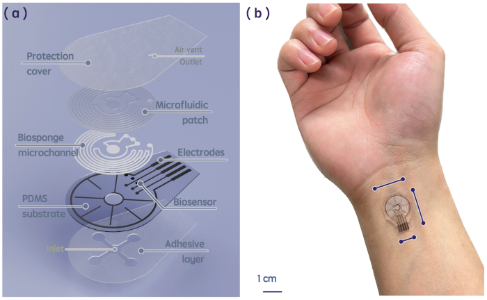 (a)積層型ウエアラブルパッチの分解図と、(b)皮膚表面に張り付けた状態