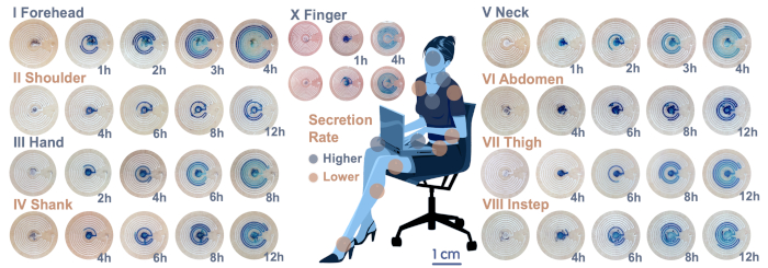 研究チームは、このパッチを頭部など体のさまざまな部位に張り付けて日常生活を送る実験を行い、微量の発汗を計測した結果、パッチの有効性と信頼性を確認した。