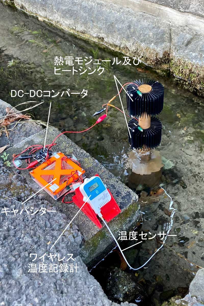 湧水に浸すだけで季節や昼夜を問わずいつでも発電が可能