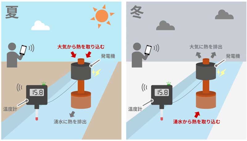 湧水温度差発電の原理図。季節によって大気と湧水の異なる熱源から熱を取り込むことによって発電する仕組みだ