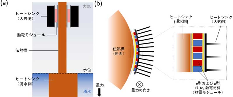 開発した湧水温度差発電装置の概要図(a)。湧水温度差発電装置を上方から眺めた断面図と拡大図(b)。拡大図を見るとヒートシンクのフィンの向きが重力に対して平行に取り付けられており、ヒートシンクが大気の熱を対流によって効率的に授受できる構造であることが分かる