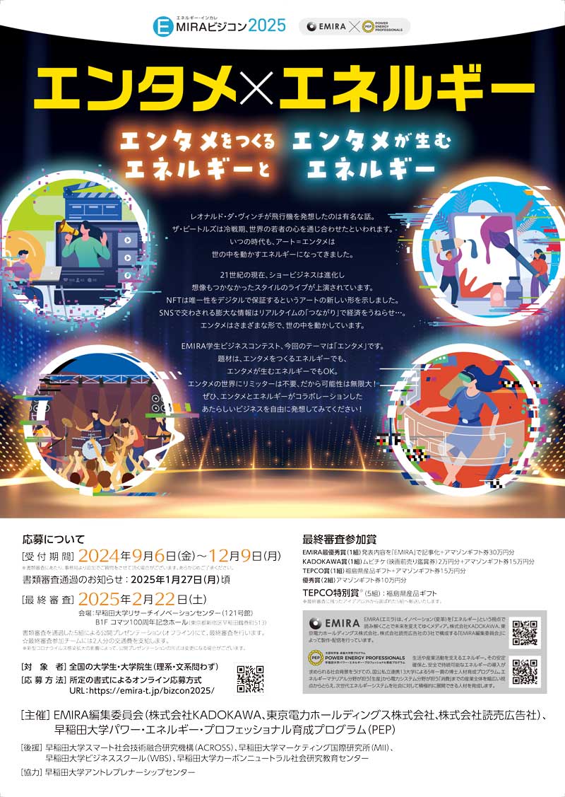今年度も、「EMIRA」と「早稲田大学パワー・エネルギー・プロフェッショナル育成プログラム(PEP)」がタッグを組んで実施する学生コンテスト「EMIRAビジコン2025 エネルギー・インカレ」の開催が決定! 今回は「エンタメ×エネルギー」をテーマに、未来をより良くするビジネスアイデアを募ります。