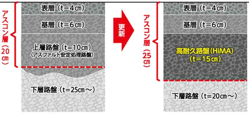 新たに開発されたHiMAを上層路盤に使用した舗装補修工事は、舗装の補修頻度を低減させることを目的に、舗装厚が比較的薄い箇所や路床および路盤の脆弱(ぜいじゃく)化が進む箇所を対象に実施する。