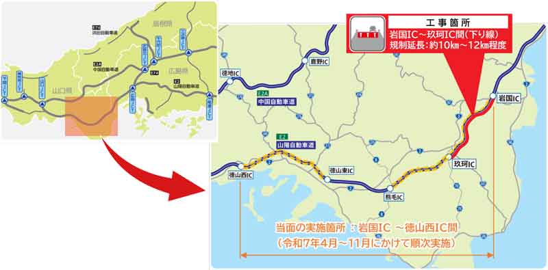 現在、NEXCO西日本中国支社管内の山陽自動車道岩国ICから玖珂IC間の下り線において工事が進行中。2025年4月には同じく岩国ICから徳山西IC間でも着手予定だ。