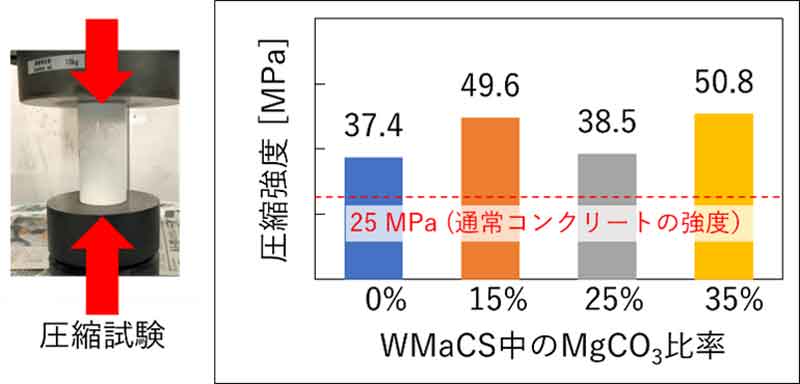 一方、ポルトランドセメントにWMaCSを混ぜただけのコンクリートはCO2を固定化できる反面、施工性が悪化しひび割れなどが生じ強度も不足するなど、実用化への課題を抱えていた。