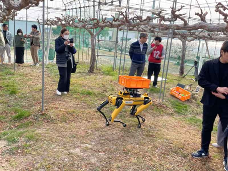 高知工科大学では2023年より栗原教授が、米国でロボットの研究開発を行うボストン・ダイナミクス社が開発した四足歩行ロボット「Spot」に収穫物を運ばせるシステムを学生たちと研究・開発。これまでも地元のユズ農場で収穫したユズを指定した場所まで運び、元の場所へ戻ってくる実証実験を行ってきた。