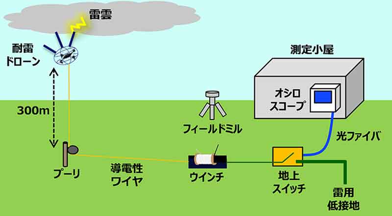 実験イメージ。フィールドミルで電界強度の上昇を確認した時点で、導電性ワイヤでつないだ耐雷ドローンを高度約300mまで飛行させ、地上スイッチでドローンと地上を導通させた
