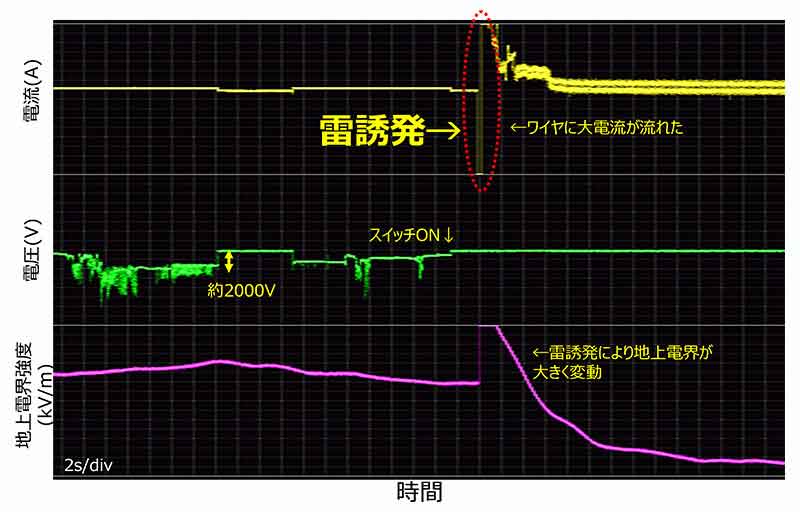 さらに、2024年12月13日、雷雲の接近を確認しドローンを飛行させたところ、導電性ワイヤへ大電流が流れ込んだ。このことでドローンによる雷誘発を確認。さらに地上の電界強度に大きな変化も確認された。