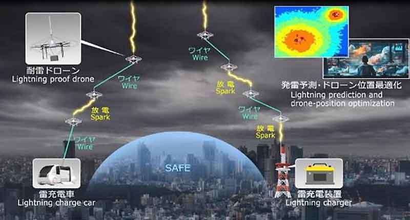 そこで着目されたのが、近年発展著しいドローンを「耐雷化」させ、ドローンで雷を積極的に誘発、安全な場所へ誘導する「ドローン誘雷」の手法だ。