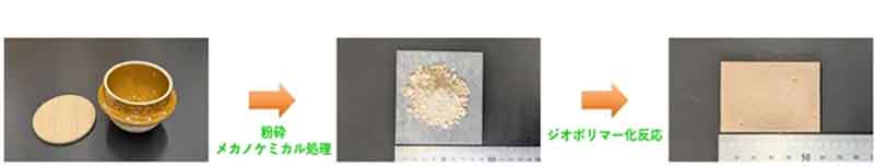 この釜を環境に優しいタイルとして再利用するために、「メカノケミカル処理」(粉末状にした釜に機械的エネルギーを加え、結晶の一部を非晶質化する処理)と「ジオポリマー化反応」(非晶質化した粉末にアルカリ活性剤を加え、60℃で反応を進める)の技術を適用した。