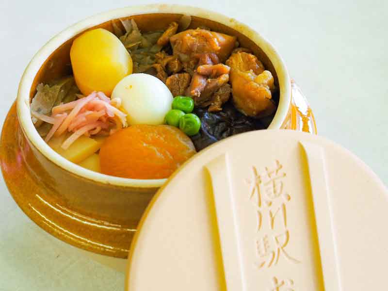 「峠の釜めし」は1958(昭和33)年より国鉄(現・JR東日本)信越本線の横川駅(安中市)で発売。長い列車旅の際、「温かい弁当を食べたい」という乗客の声をもとに、荻野屋は栃木県で生産される陶器・益子焼の土釜を容器に採用した。以来、これまでに累計約1億8千万個が食されたという駅弁を代表する人気商品となった。