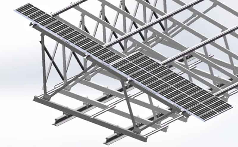使用停止レールに架台を金具で固定しPVシステムを設置することで、通常の太陽光発電を行う際に必要な基礎工事が不要になる。
