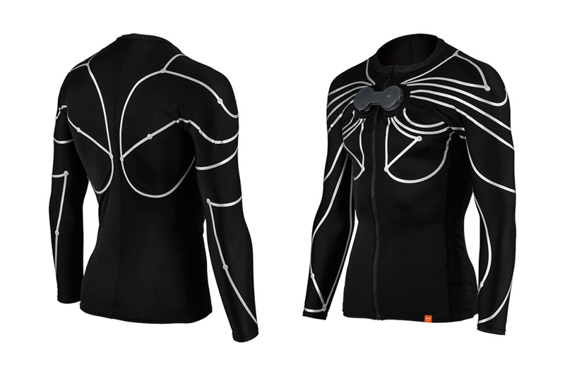 シャツの腹部にはセンサーが入っていないが、ハブに6軸のジャイロセンサーが備わっているため、上半身の傾きもしっかり検知できるという。