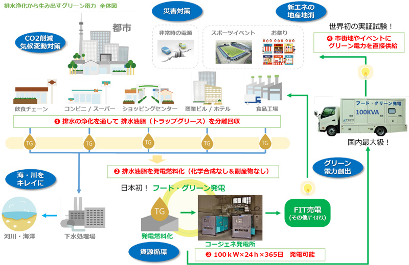 同社は今後も首都圏のイベントでバイオマス発電車による実証実験を重ね、2020年までに排水浄化からグリーン電力を生み出す「フード・グリーン発電システム」の首都圏全域への普及を目指すという。