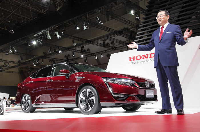 2015年に開催された第44回東京モーターショーで、ホンダ初の燃料電池電気自動車「クラリティ フューエル・セル」の市販モデルを発表する、八郷隆弘本田技研工業代表取締役社長