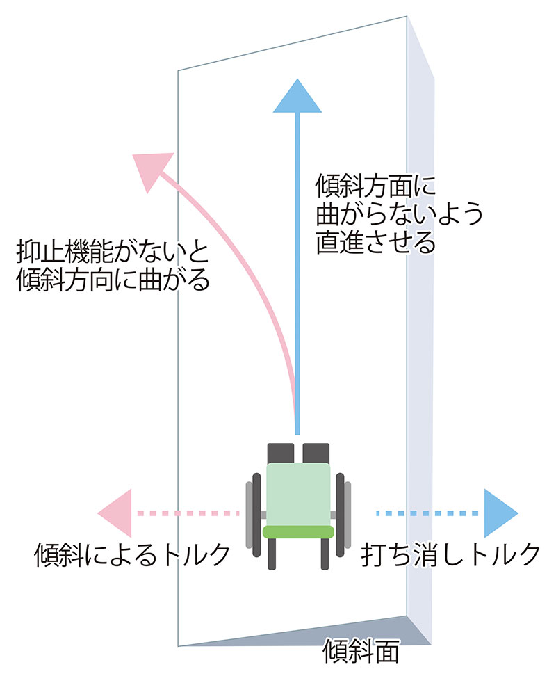 車いすは通常、道が横方向に傾斜している場合、傾斜により回転軸に働く力(トルク)が発生してしまうため、そのままでは傾斜方向に曲がっていってしまう。