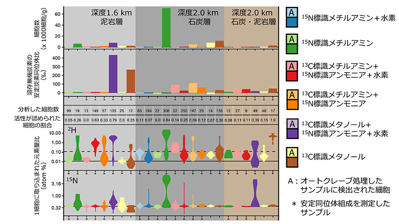 採掘した海底下約1.6kmの泥岩層(頁岩:けつがん/粘土が固まってできた水成岩)と、約2.0 km付近の石炭層(褐炭)のコアサンプル(柱状の地質試料)に生息する地下微生物の代謝活性について、超高空間分解能二次イオン質量分析器(以下、NanoSIMS)を用いた分析結果は以下の通りだ。
