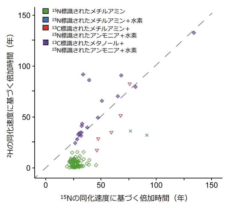 他にも、1細胞あたりの全窒素と全水素の量、30カ月間に固定された窒素と水素の量の割合から細胞の倍加時間を推定したところ、数十年~数百年の時間を要することなどが判明した。