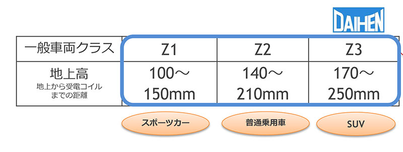 これは乗用車用途として最も大きな電力を必要とするWPT3までを網羅し、全車種の地上高に対応していることを示している。