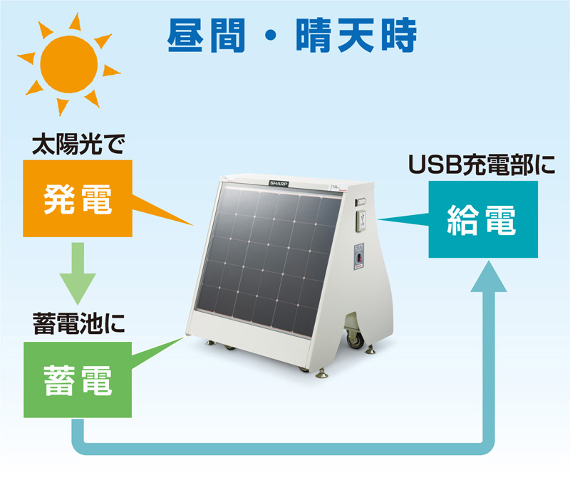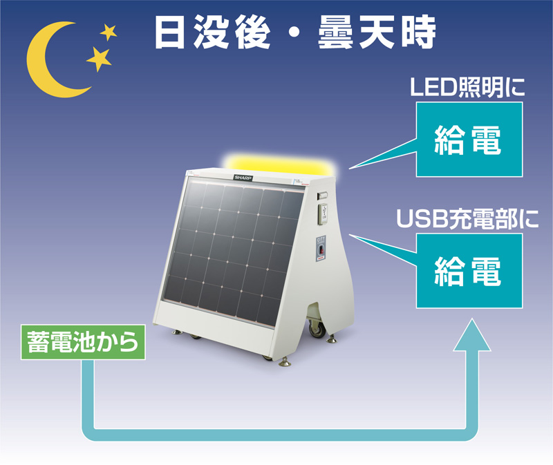 ポイントは、日没後や曇天時であっても蓄電池に蓄電された電気によって給電が可能になることだ。