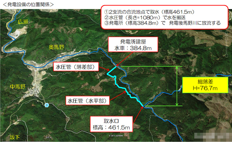 2018年2月には工事を着工し、2019年4月の稼働を目指している馬野川上流の小水力発電所。
