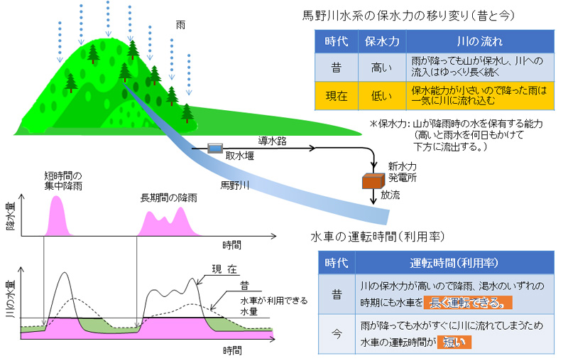 これはつまり、雨が降っても水がすぐ川に流れてしまうため、水車が利用できる水量が減少、すなわち水車の運転時間が短くなってしまうことを示している。