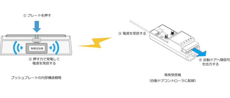 まず、プレートを押すことで無線通信器に必要な電力を発電し、電波を発信。自動ドアコントローラーに配線された専用受信機が電波を受信し、自動ドアに信号を出力して開閉させる。仕組み自体はシンプルだが、そこには今後の社会を見据えた開発者の思いが込められている。