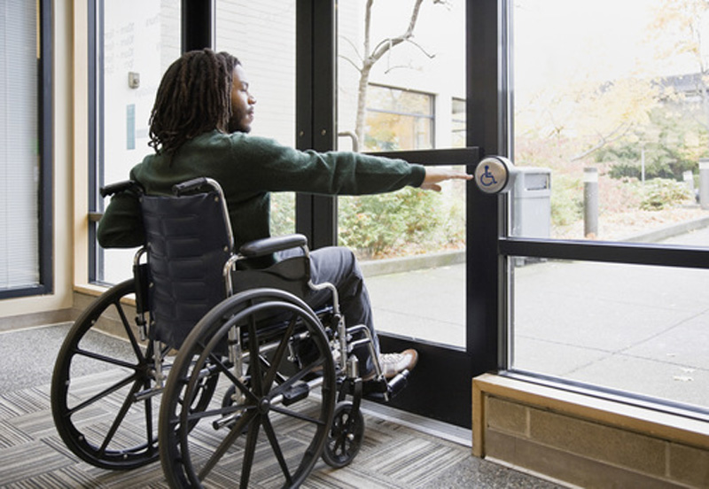 対して北米では、扉が手前や奥側に開閉するスイングタイプ(開き戸)が主流だ。しかし、大きく重いドアや回転式の自動ドアは、障害者や高齢者にとってドアの開閉や通り抜けの際に大きな障壁となっていた。そこで、ドア横などに開閉用のスイッチを設置し、全ての人が建物にアクセスしやすいよう工夫が施されている。