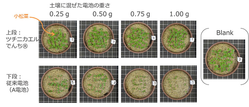 土壌に粉砕した使用済み電池を混合し、鉢に植えられた小松菜の発芽状態で評価する手法を用いたその実験結果では、ほぼ発芽しなかった従来電池のように植物の成長を妨げる影響は確認されなかったとのこと。これは「土に還る」という開発コンセプトの実現を意味している。