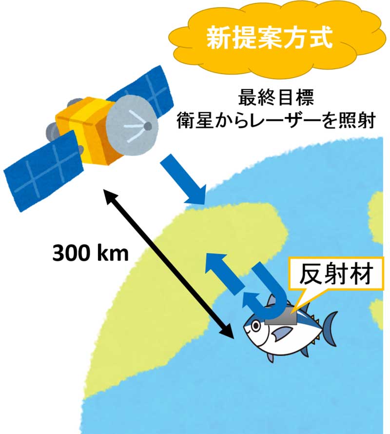 その再帰性反射材を取り付けたマグロにレーザーを照射して、反射した光から水中のマグロを追跡。人工衛星を通じて瞬時にデータを取得することができ、回収の手間を省いて効率よく、長時間のリアルタイム追跡記録が可能になる。加えて、反射材に薄いシート状の軽量素材を用いることで、マグロに過度な負担を強いることなく装着もできるという。